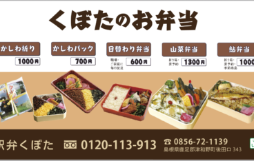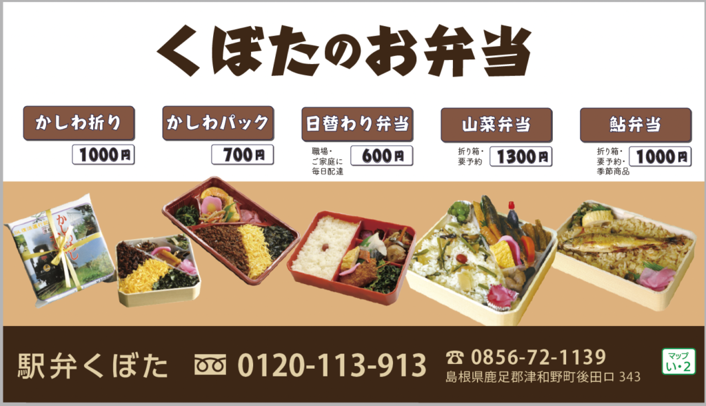 年末年始情報 駅弁 くぼた 2021年2月26日 2025年12月14日 Facebook icon Twitter icon Google+ icon Line icon 栄養バランスを考えた献立です!安くて美味しいふるさとの味をご自宅でお楽しみ下さい! ◆9:30~16:00 ◆数の多い場合は3日前まで要予約 ◆定休なし 日替わり かしわ飯(パック) オードブル お問い合わせ ☎︎0856-72-1139